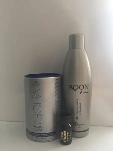 İgora Royal mavi toz açıcı 4 ölçek + Roon mavi oksidan %9 8 ölçek ile saç boyları + 5ml Liquid Keratin