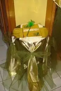 Sandalyeler üzerine tül ve dore çiçeklerle süs yapılmış.