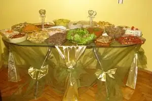 Yemeğin sunulduğu masa, hoş uyumlu şekilde süslenmiş.