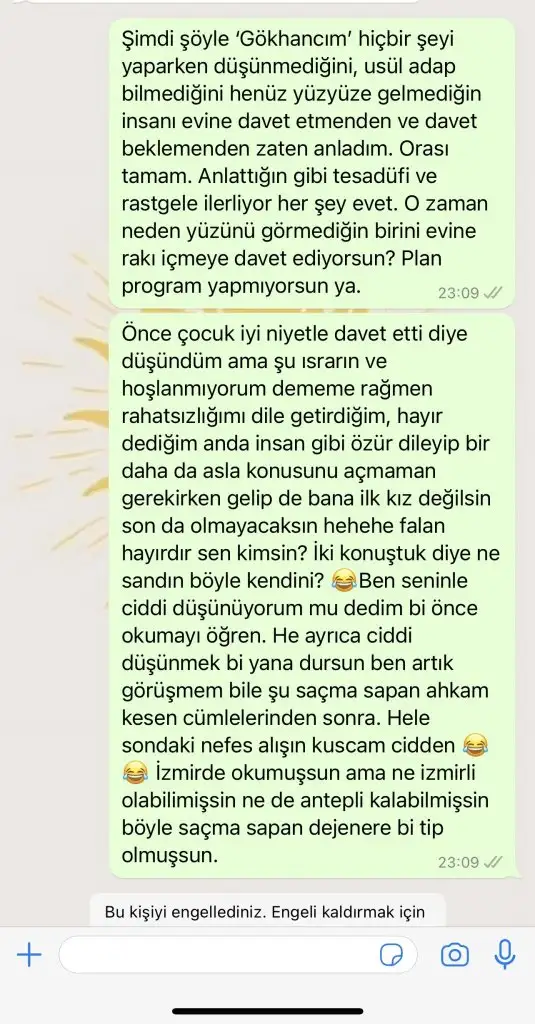 Çok doğru ya. Asla değilim. Cevap verse de vermese de yarına kadar bekleyip engelleyeceğim.1. Usul adap bilse (dini ya da ahlaki görüşü farketmeksizin) en azından aranızda bir şeyler gelişene kadar eve davet etmez/ davet beklemez.