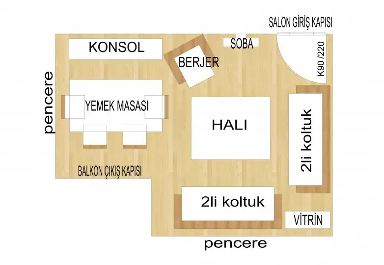 minumum ölçekte,basit tabirde herkesin anlayacağı gibi.size çizgisel konumlandırma ekliyorum. kolon -oda ebatlarını bilmediğim için,varsayım olarak fikir sunabilirim.Eklediğim konumlandırma 15m2lik bir oda örneği. berjerlerinizin birini oturma odanıza ilave edebilirsiniz.Örnekte 4 sandalye mevcut,konsol kapakları açılması için,kalan 2 sandalyenizi sıfıra sıfıra olarakta yemek masanıza koyabilirsiniz.Ve yahutta mutfak masası varsa yanına ilave edebilirsiniz.Canınızı sıkmayın.Mutlu bir ömrünüz olsun.Eki Görüntüle 1217658
