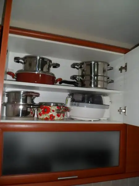 üstteki rafta çelik tencereler ve pilav yapmak için ayrı tencerem var