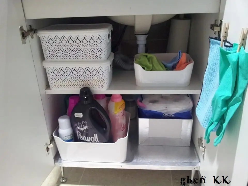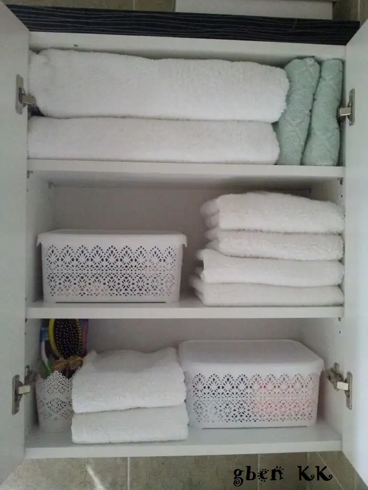 Bu da benim banyo dolaplarımın içi. Üst dolapta havlular, aşağı dolapta deterjanlar, temizlik bezleri ve temizlik malzemeleri var.