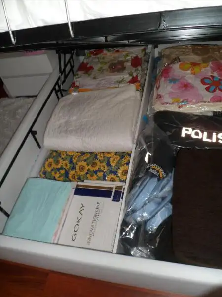benim bazamın altına bakarsan sol baş tarafta üst üste 3 tane yün yorgan onun önünde bir kişilik eşlyaf yorgan ve üstünde yatak örtüm onun önündede kutularda nevresim takımları var
