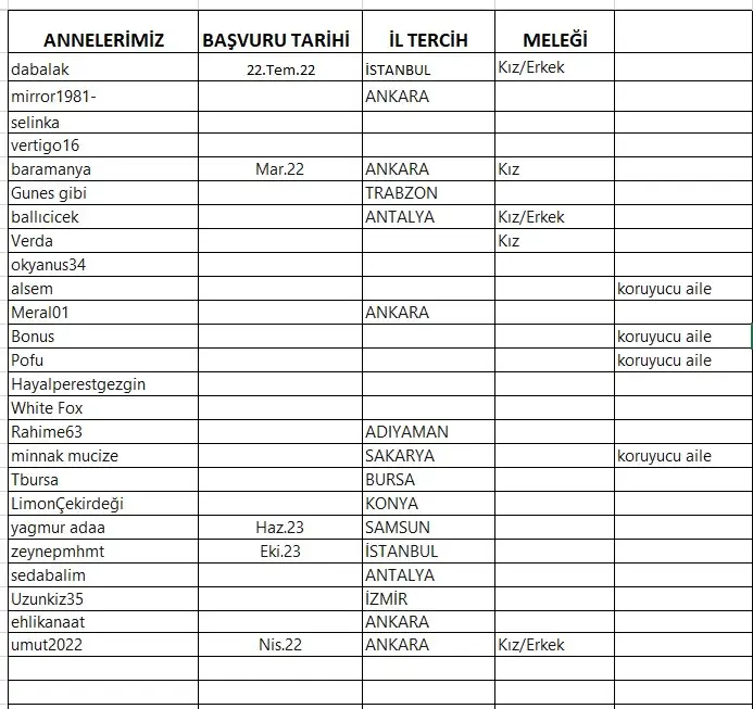 Günaydın hanımlar, nasılsınız var mı yeni güzel haberler, bu platform biraz daha hareketlense keşke mesela bir liste yapsak evladını bekleyenler şehir kız erkek onay tarihi olarak hepimize moral olurdu, ilk bu konu açıldığında yapmışlar ne güzel ne dersiniz hazırlaması benden