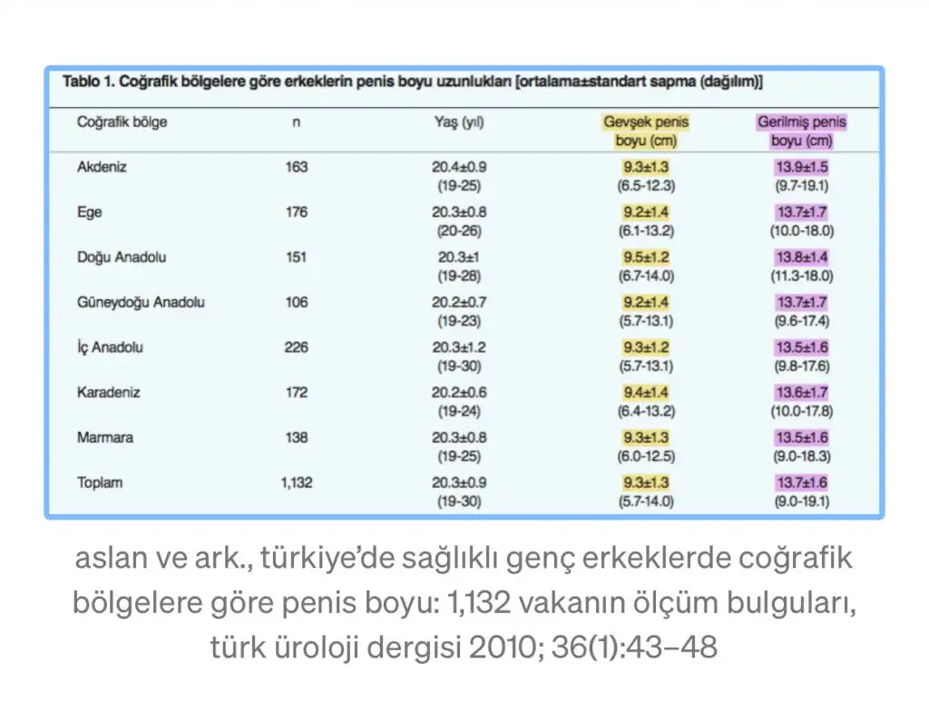 İstatistiği doğru okuyun önce. Gevşek penis boyu ortalaması toplamdaki ortalaması 9,3 cm (5,7 - 14 cm arası değişiyor.) gerilmiş penis boyu yani ereksiyon halinde Türkiye toplam ortalaması 13,7 cm (9,0 - 19,1 cm arası değişiyor.) Aktif üyelere niye ayıp ediyor muşum? Sana ne? Sana mı sorucam ne okuyup yorumlayacağımı?Tamam konuyu hortlattınız ama uzatmayın isterseniz. Aktif üyelere ayıp ediyorsunuz.