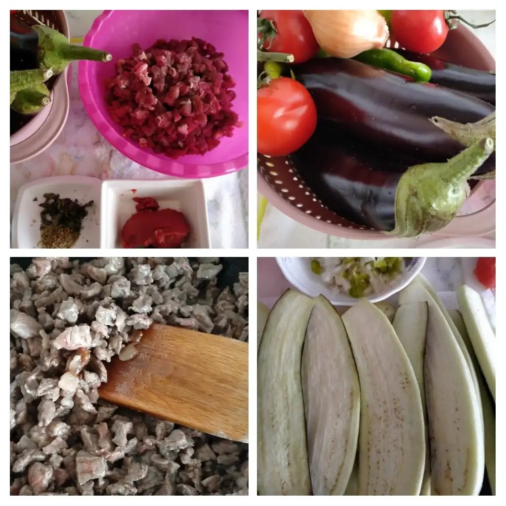 Et suyunu çekene kadar patlıcanları soyup tuzlu suda bekletelim.