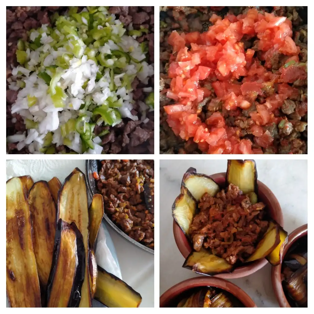 Tek porsiyonluk guveclere önce patlıcanları yerleştiriyoruz sonra iç harç koyup kapatıyoruz.