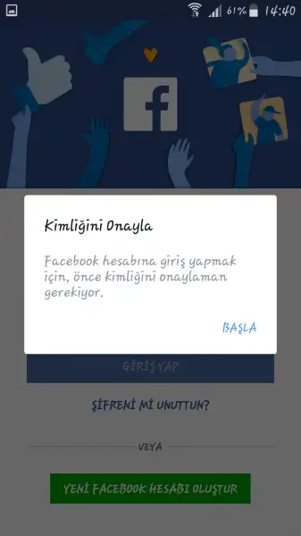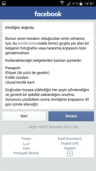 Ben olsam hayatta kimlik bilgilerimi vermem. Ne alaka canım. Ya başka bir şey varsa bu işte?Facebook hesabımın kimin girdiginden şüphe etmis o yüzden facebook un bana ait oldugundan emin olabilmek icin sifreyi dogru girdigim halde kabul etmiyor kimlik istiyor ispatlamam için hesabin bana ait oldugunu. Fakat kimligimde evlilik soyadim yaziyor doğum tarihimde farkli o yuzden hesabin benim oldugunu kabul etmiyor