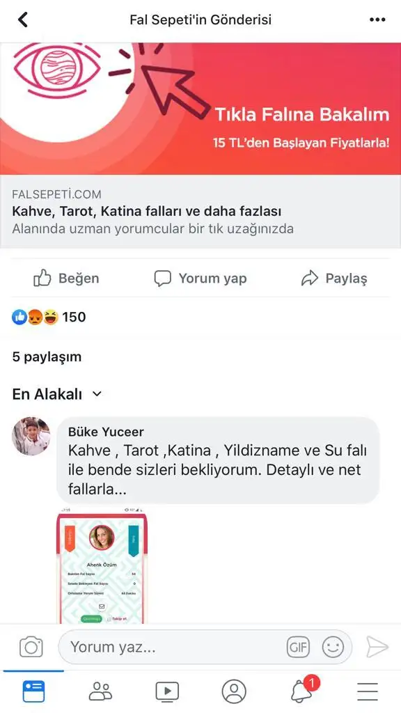 iyi de kendisini övmesi burda insanları ne kadar doğru?? helal para mı kazanmış oluyor böyle yaparakTartışmaları bende okudum , burada kişinin hatası kendini övmek bunu birçok sitede yapan var çok şahit oldum bende ama isteyen gönderir isteyen göndermez burada sadece bizler öneri alır öneri veririz. Kimsenin ekmek parasına girmeye hakkımız olmaz diye düşünüyorum. Güzel bir dille uyaralım arkadaşları ve gerekirse o falcı arkadaşıda uyaralım. Bende baktım Facebooktan profiline çoluğu çocuğu varmış rıskına gitmeyelim.