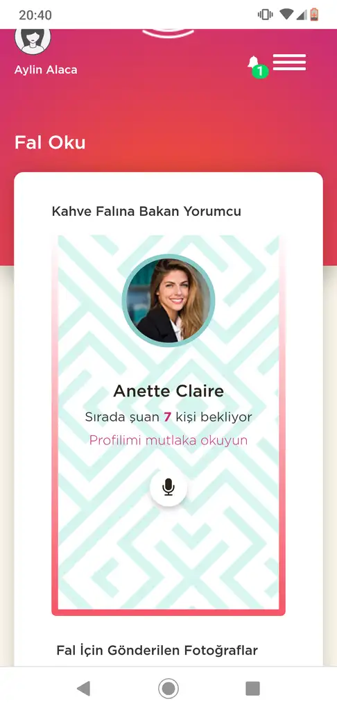 Bende şimdi attım demek önümdeki 1 kişi sizsinizAnette Claire, Venüs Ateş, Bade Doğan isimli falcılara kahve falı attımToplam 75 kredi tuttu.