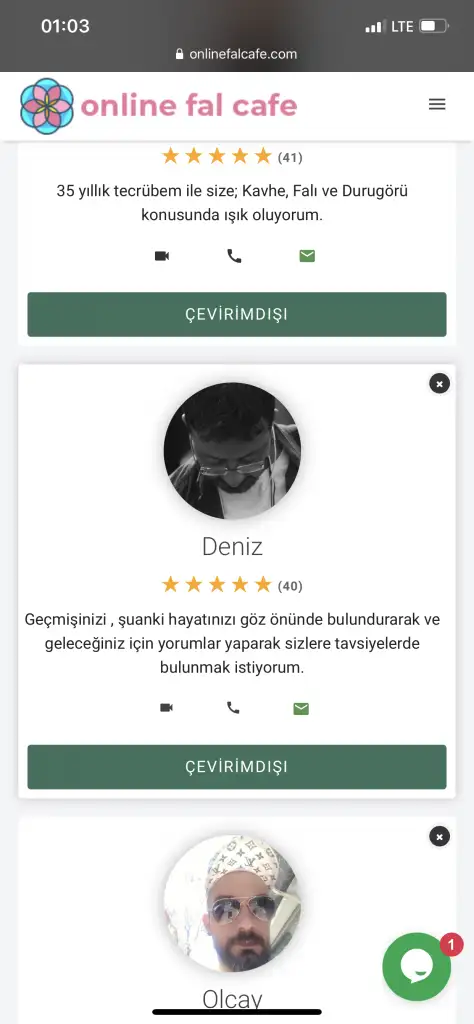 Ben kötülemek istemem kimseyi ama daha önce de dedim Falsepetindeki Sezen Yıldız ve onlinefalcafede ki Vega aynı insan. Ben sesli baktırdım, ve Sezen Yıldıza çok baktırmıştım falsepetinde, daha ses kaydı başladığında anladım kendisi olduğunu hem ses hem kullandığı kelimeler aynı, birebir aynı. Sadece falsepetinde bana olumlu konuştu olacak felan filan mutluluk... online fal cafede olumsuz konuştu, artık hangisi tutarsa, nasıl olsa yorumlardan biri tutar da dönerim tekrar baktırmaya.Online cafe olayına bir bakmak istedim. Özgür can ve medyum gizemin profil fotoları var. İsimleri değişik.