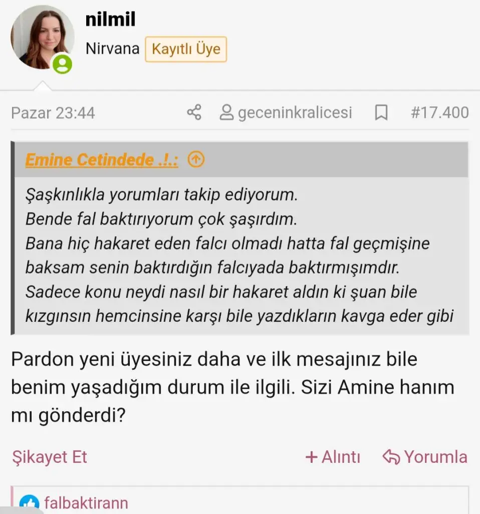 Evet canım fikirlerimi paylaşınca senin gazabına uğrayınca arkadaştan da girdim çünkü şikayet etmişsin kendini de beni de pasife aldirmissin ama ben seni inceledim anladım yani sorunlarıni ilk defa da ceza aldım senin yüzünden neden insanlar sana cevap vermiyo falan anladım bela oluyosun muhatap olmuyolar rahat ediyolar bende olmucam çekmeye çalışma ben takip edip fal baktiriyorum daha fazla beni rahatsız edersen tüm hesabını şikayet ederim seni musallat diye çünkü kimse seni çekmek zorunda değil ben hiç değilim yine söylüyorum senin yerin burası değil bence şahsi fikrim yaniArkadaşlar, "emine çetindede" isimli üyenin bu mesajına tıklayınca birden üyenin ismi değişip "tugbaak23" isimli üyeye dönüşüyor. Çifte üyelik olabilir, ben moderatöre şikayet ettim. Siz de dikkatli olun. Özelinizi paylaşmayın.