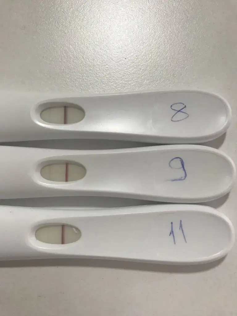 Üç yıllık evliyim senelerdir pcos Hastasıyım. İlk defa bu ay adetim 3. gün başlayarak günde 2 × 5 gün boyunca kullandım. 8. gün doktor kontrolüne gittim yumurtamın 22 mm boyutundaydı Ve doktorum 8 Aralıkta ovitrelle Çatlatma yinesi yaptı. 7. güne kadar kasık ve bel ağrılarım vardı 8. ve 9. günü test yaptığında belirgin çizgiydi bugün 11. gün tes yaptım da daha silik bir çizgi gözüküyor. Son üç gündür adet olacakmışım gibi belirtilerim var. 8. 9. ve 11. gün olan testlerimi ekledim. Sizce hala iğne etkisi mi yoksa gebelik var mı?