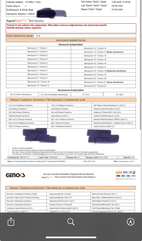 Ben 4 haftalıkken hamile olduğumu öğrendim. 8. Hafta ufak bir kanama geçirdim ama ultrasonda kanama alanı göremediler. Sonra 10. Hafta herhangi bir bulgu yokken doktorum Fetal dnadan bahsetti 2li ve 3lü ile uğraşmayalım diye. Bende yaptırdım ve sonucum Trizomi 21 yüksek risk geldi. Doktorum bana bunun yanılma olasılığının olmadığını hemen perinatoloğa gidip amniyosentez yaptırıp, sonlandırma yapılması gerektiğini söyledi. Bende prof. bir perinatoloğa gittim. 16. Haftaya kadar bekledik amniyosentez için bu sürede sürekli ultrason ile kontrol ediliyordu ve her şey sağlıklı ilerliyordu ve amniyosentez oldum güvenli haftada ve işi bilen doktorla yapılınca oldukça güvenilir bir işlem. 1 hafta sonra ön sonucum geldi. Vee sonuç temiz. Kadın doğumcum hatta şaşırdı. Niptin yani fetal dnanın yanılmasını beklemiyorlar. Ancak şunu söylemeliyim ki bu süreçte deli gibi araştırdım hem Türkçe literatür hem yabancı taradım. Fetal dna evet %99 hassasiyet ile çalışıyor. Evet sende yüksek risk çıktıysa vücudunda plesantada bu problem var ancak bu kesinlikle bebek etkilenmiş demek değildir. Yabancılarla ppv değeri diye bir şey var ( positive predictive valuses) yani bebeğin etkilenmesini gösteren bir değer. Ben kendimle ilgili hesaplama yaptığımda fetal dna sonucumu yaşımı ultrason verilerini girince bebeğim %52 etkilendiğini %48 etkilemediğini gösteren bir değer çıkmıştı. Yani demem o ki fetal dna yüksek geldi ise ultrason da her şey normal ise enseyi karartmaya hemen gerek yok çünkü plesanta sağlıksız bebek sağlıklı olabiliyor. Plesantanın sağlıksız olması bebeği hiç bir şekilde etkilemiyor. Bir de şu ihtimal de var hamileliğin başında ikiz gebelik yaşanıp kaybolan ikiz sendromu olabiliyormuş. İkizlerden biri sağlıksız ise anne karnında düşük olmadan eriyormuş bunu anlamak zor olabiliyormuş ve bu küçük kanama şeklinde olabiliyormuş o zamanda plesantaya bu sağlıksız bebeğin dnası karıştığı için yanılma oluyormuş. Bunu da belki umut arayanlara bir nebze ışık olur diye yazıyorum.