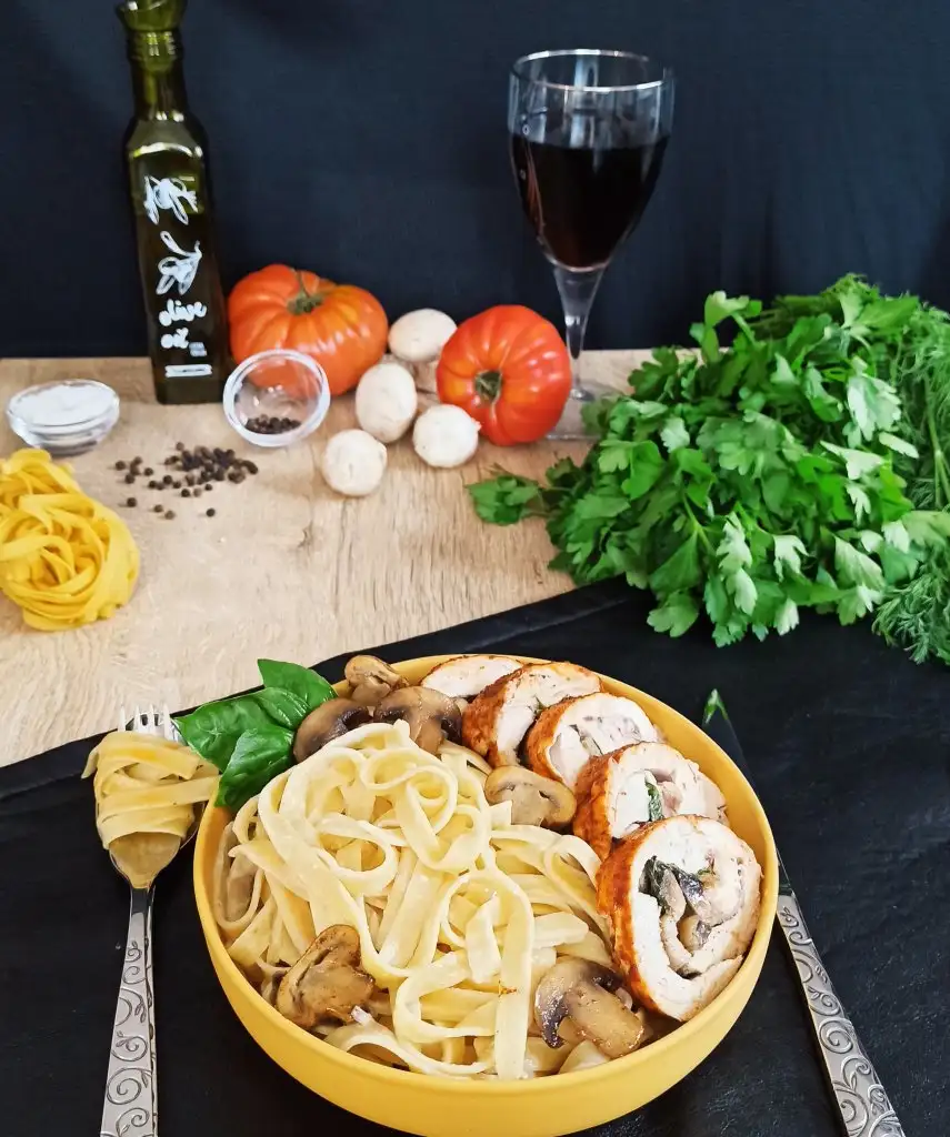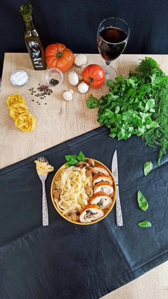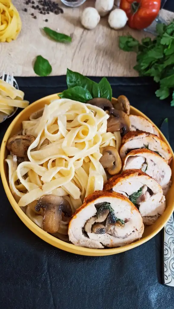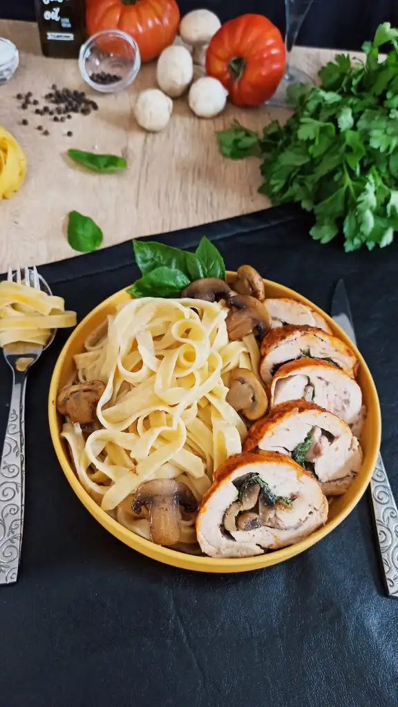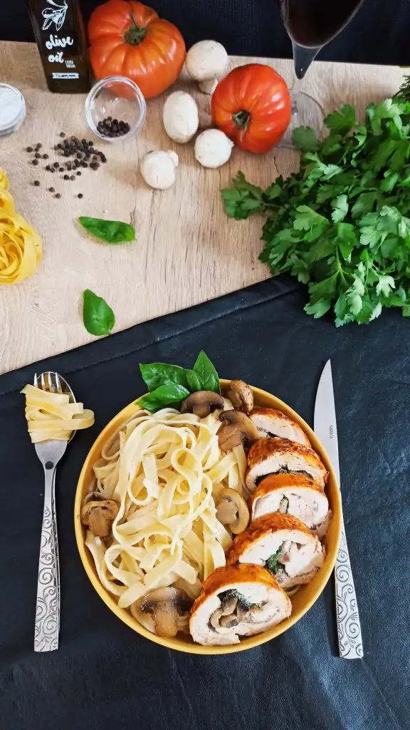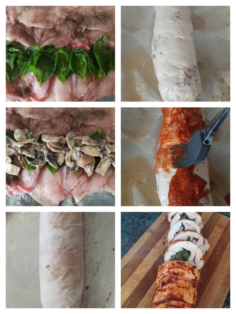 Ince açılmış tavuk parçalarını birbirinin üzerine gelecek şekilde dizip tuz ve karabiber serpiyoruz.ben öncesinde bir marinasyon yapmadım.feslegenleri dizip üzerine mantarlı harcın yarısını döküyoruz.yagli kağıt yardımıyla rulo yapıyoruz.200 derecede 25 dakika pişiriyoruz.