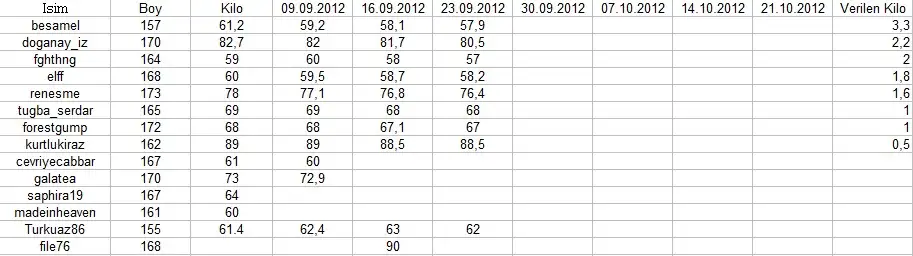 kızlaar size birsey anlatacagım bugün bir arkadaşım diyetisyene gitti bende onun yanında gittim neyse sıra aldı girdik içeri arkadasım oturuyor bende yanındayım konustular tartıldı falan ama kadın o kadar güzel konusuyorki dayanamadım bende diyetteyim kendimce gibisinden birşey dedim bana baktı sonra kaç kilosun dedi anlattım falan önce ikna etmeye calıstı kilon fazla degil saglıksız falan dedi sonra baktı olmuyor bir liste yazdı eger hiç kaçamak yapmadan uyarsam ayda 8 kilo verirmişim ben 10 istiyordum ama 8 bile fazla dedi 5 te bırakmam gerekiyormus ama ben devam edicem,liste çok fazla geldi ama kadın iddaa etti kesin verirsin fazlası olur azı olmaz gibisinden konustu şimdi listeyi yazacagım varın siz karar verin bana çok geldi :)