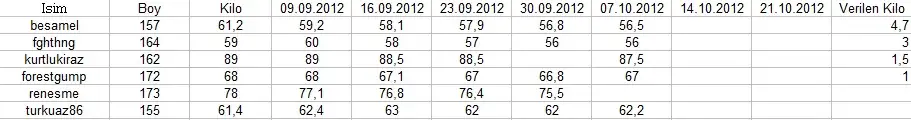 Ona göre yeni bir liste hazirlayabilirim. Yeni katilimcilarda olursa eklerim. Hem insanlarda yeni heyecan yeni motivasyon gelismis olur. Birde bence daha cok ne yediklerimizi, ve neler yaptigimiz hakkinda sohbet etmeliyiz. sadece yazip gitmek degil, herkese yardimda bulunup düsüncelerimizi yazmaliyiz. ben simdi bazi seyleri degistirmeyi düsünüyorum, cünkü veremiyorum birtülü cildirmak üzereyim!!!