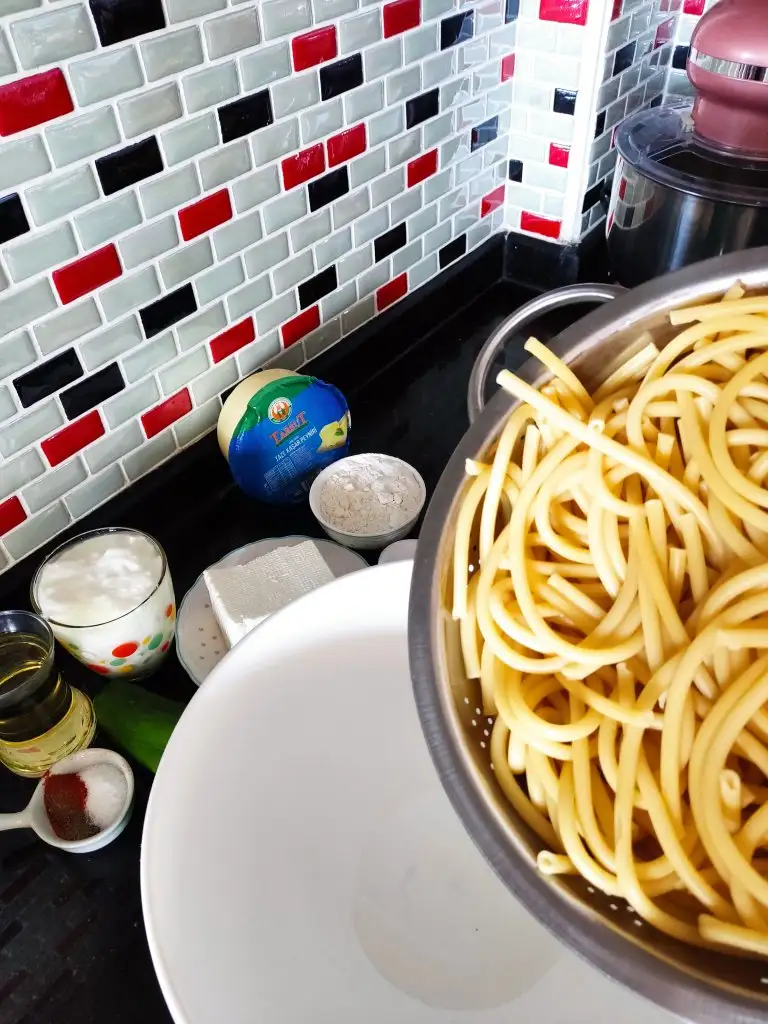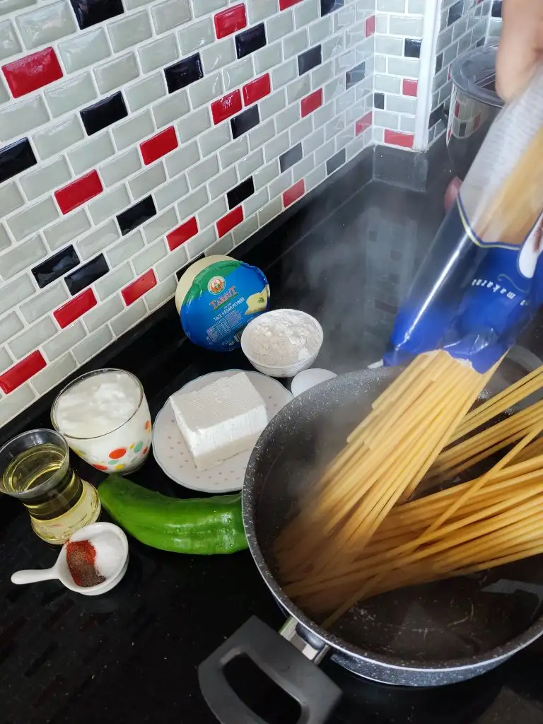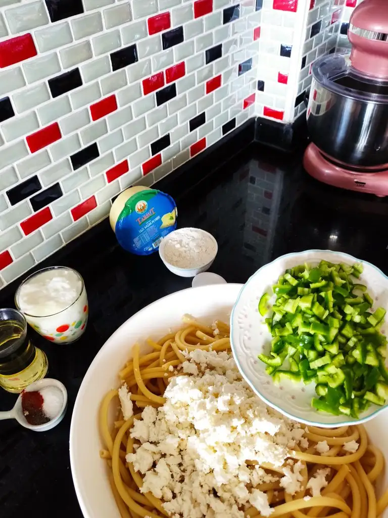 Uygun büyüklükte derin bir kaba makarnamızı döküyoruz.