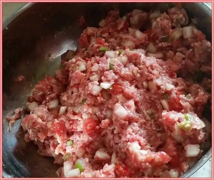 bir kaba kıymayı koyup üzerine kuru soğan - 1 tane domates - sarımsak ve 1 tane biberi ince ince doğradım, tuz ve baharatları da ekleyip hepsini karıştırdım,