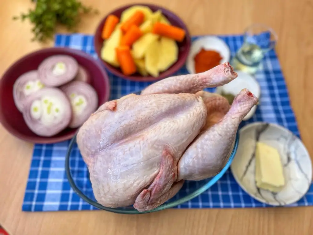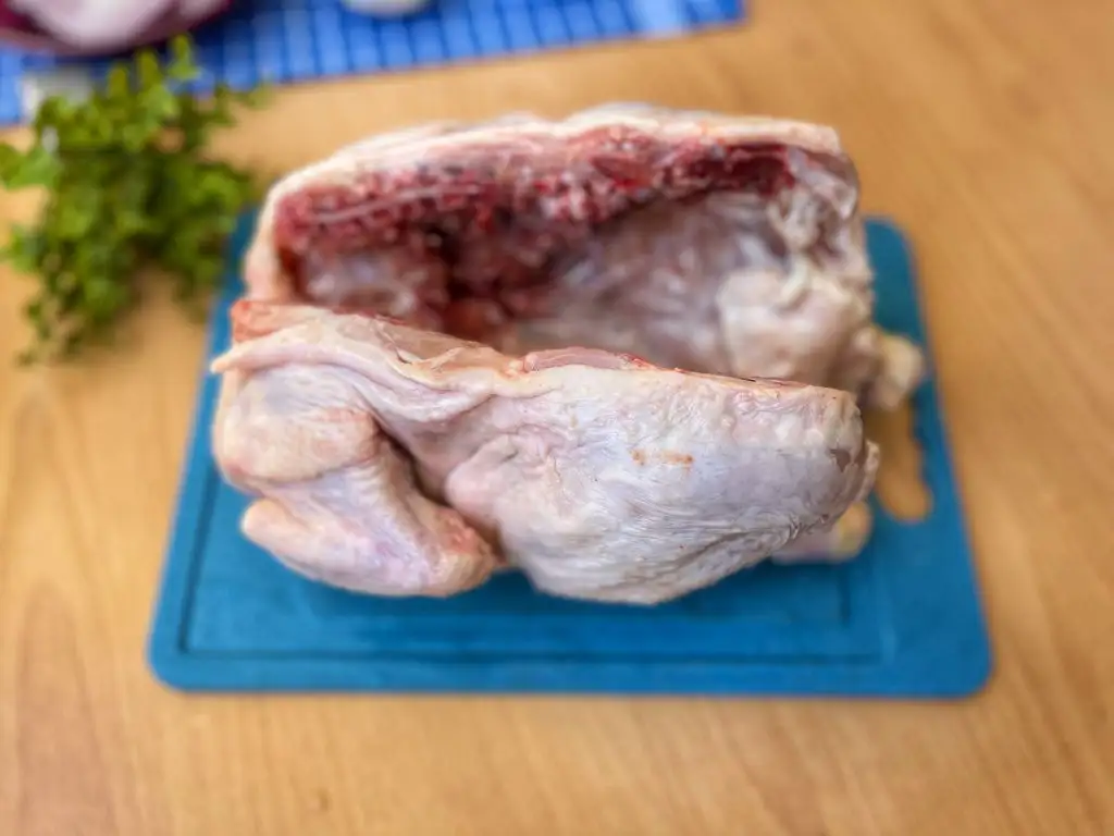 Tavuğu yıkayıp göğüs kısmı alta gelecek şekilde kesme tahtasına alalım.