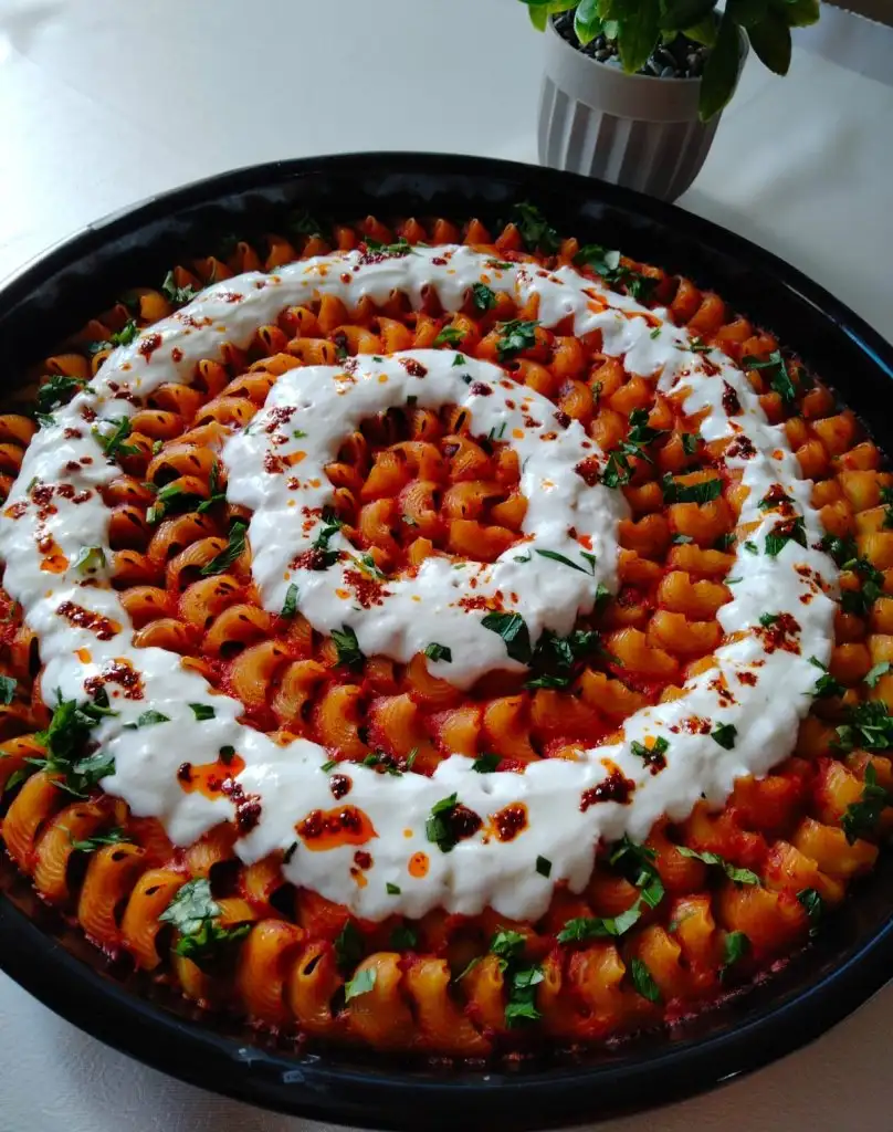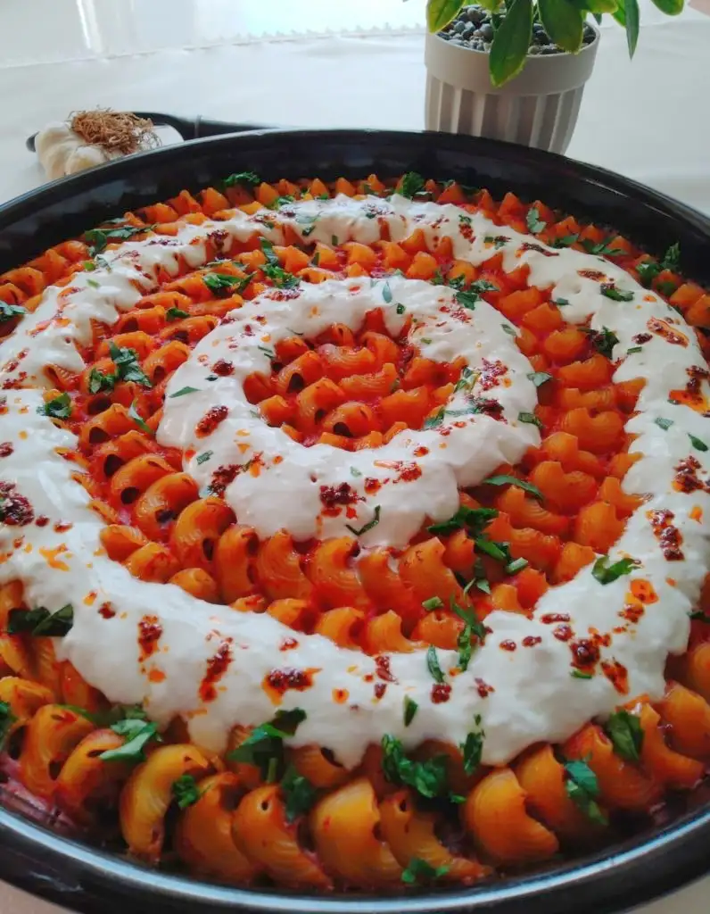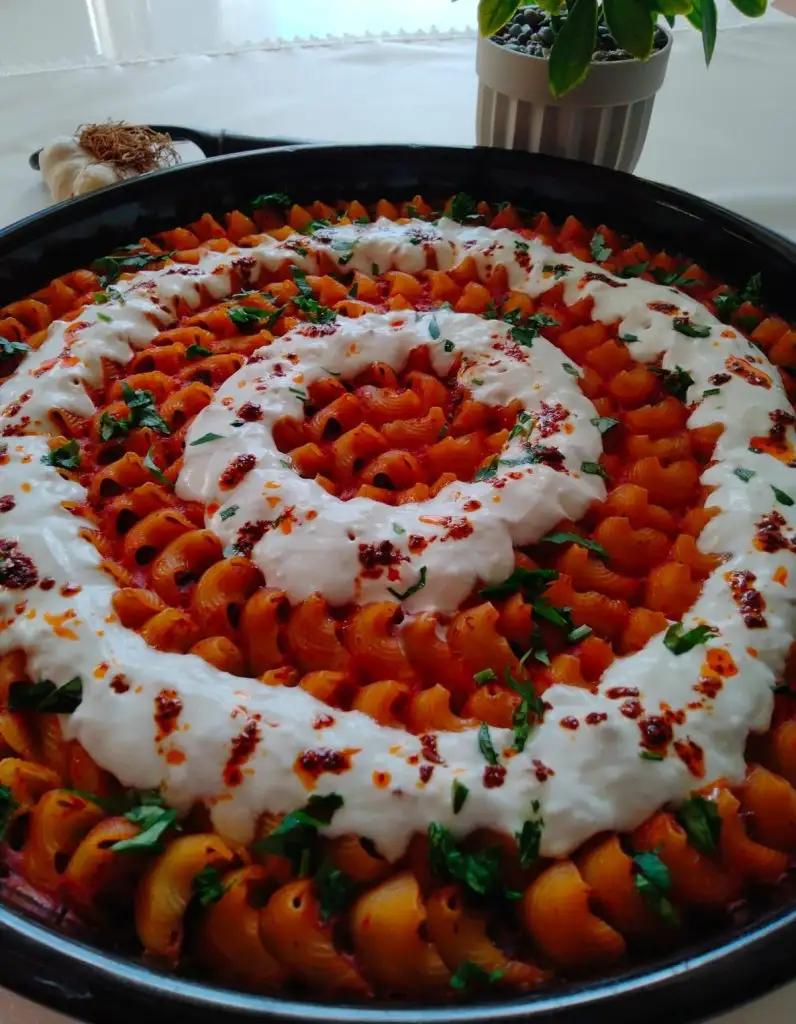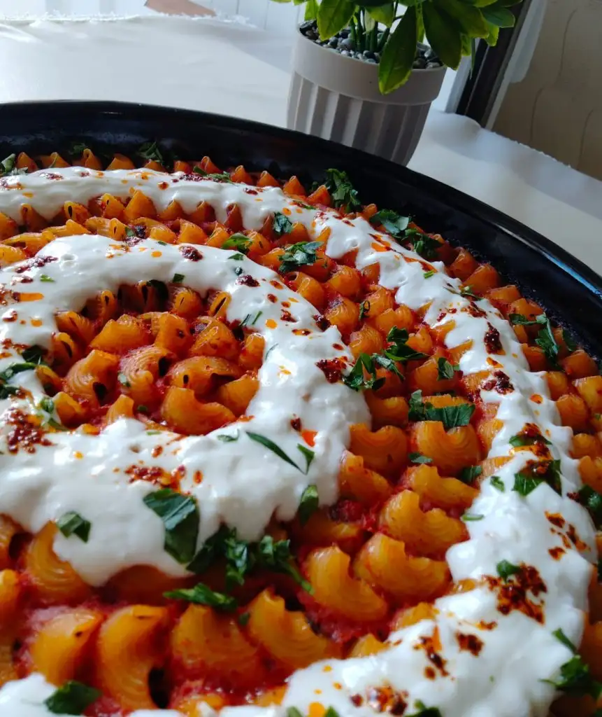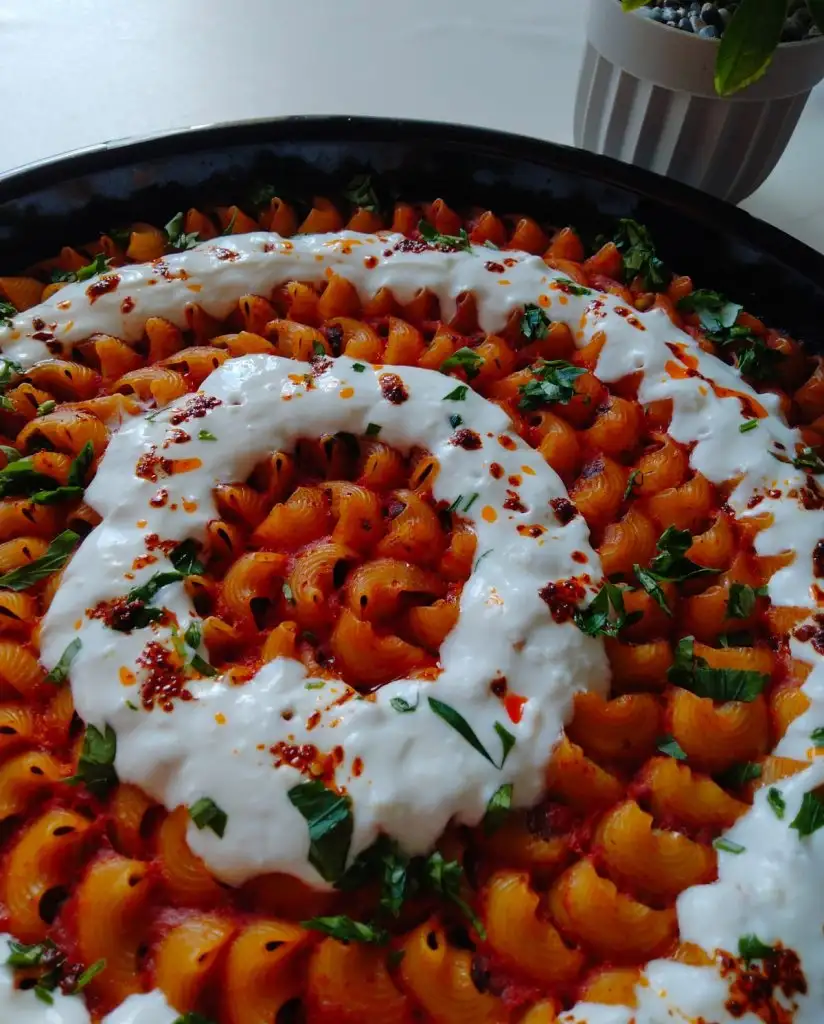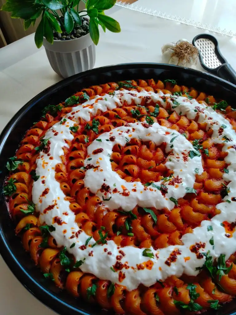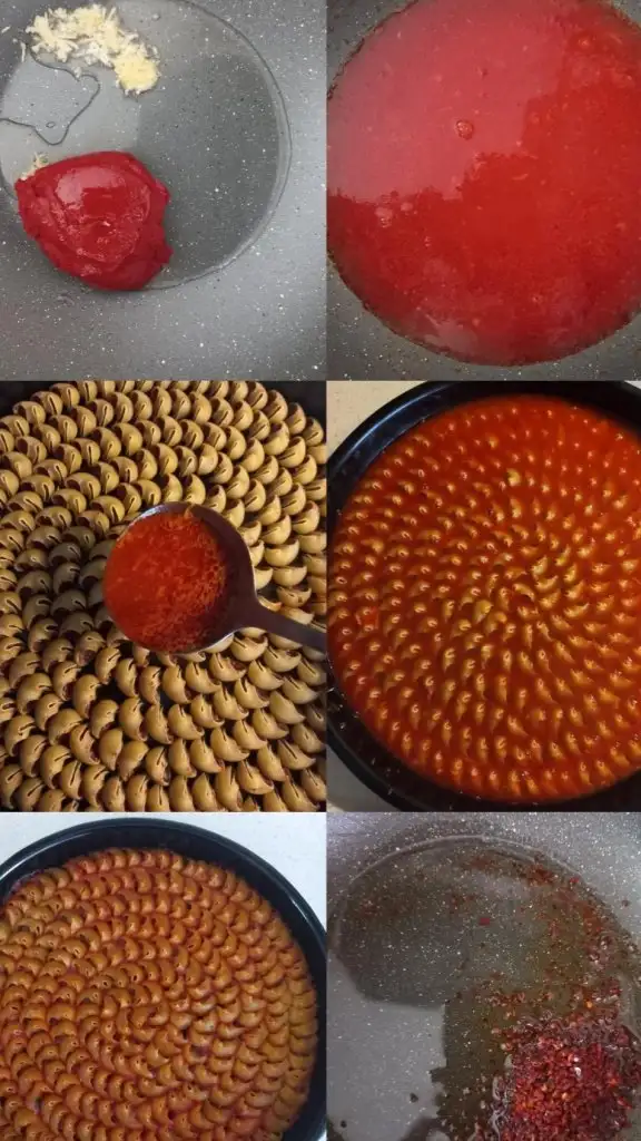 Sosu için; rendelenmiş sarımsak ve salçayı yağda kavuruyoruz. Ardından 4 su bardağı kadar şu ekleyip kaynatıyoruz. Sosumuzu kepçeyle makarnaların üzerine döküyoruz. Önceden ısıtılmış 180 derece fırında suyunu çekene kadar pişiriyoruz.Pul biberli sosumuzu hazırlıyoruz.