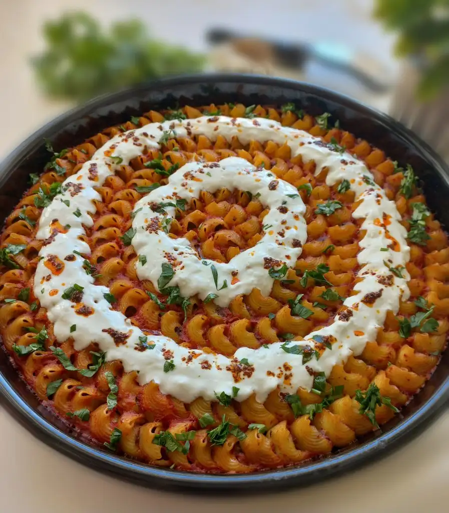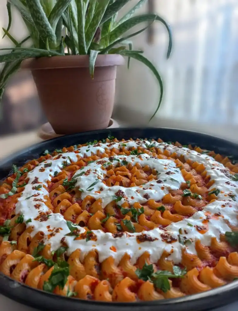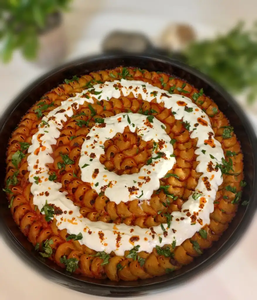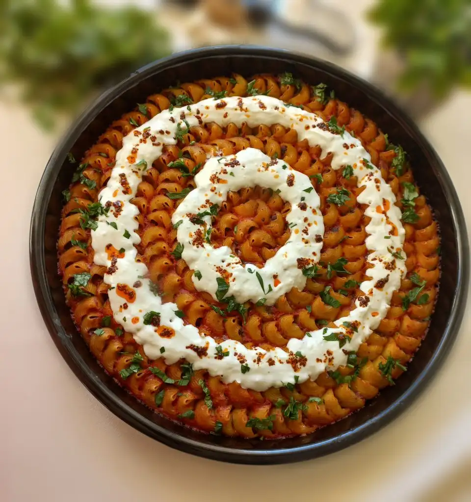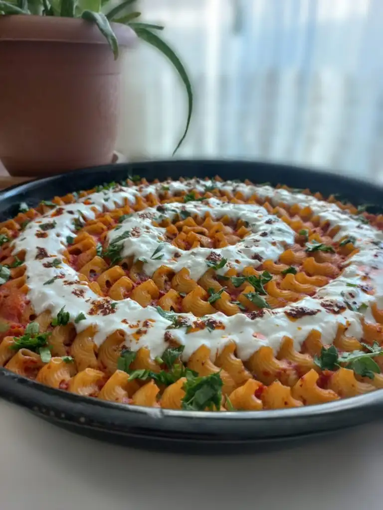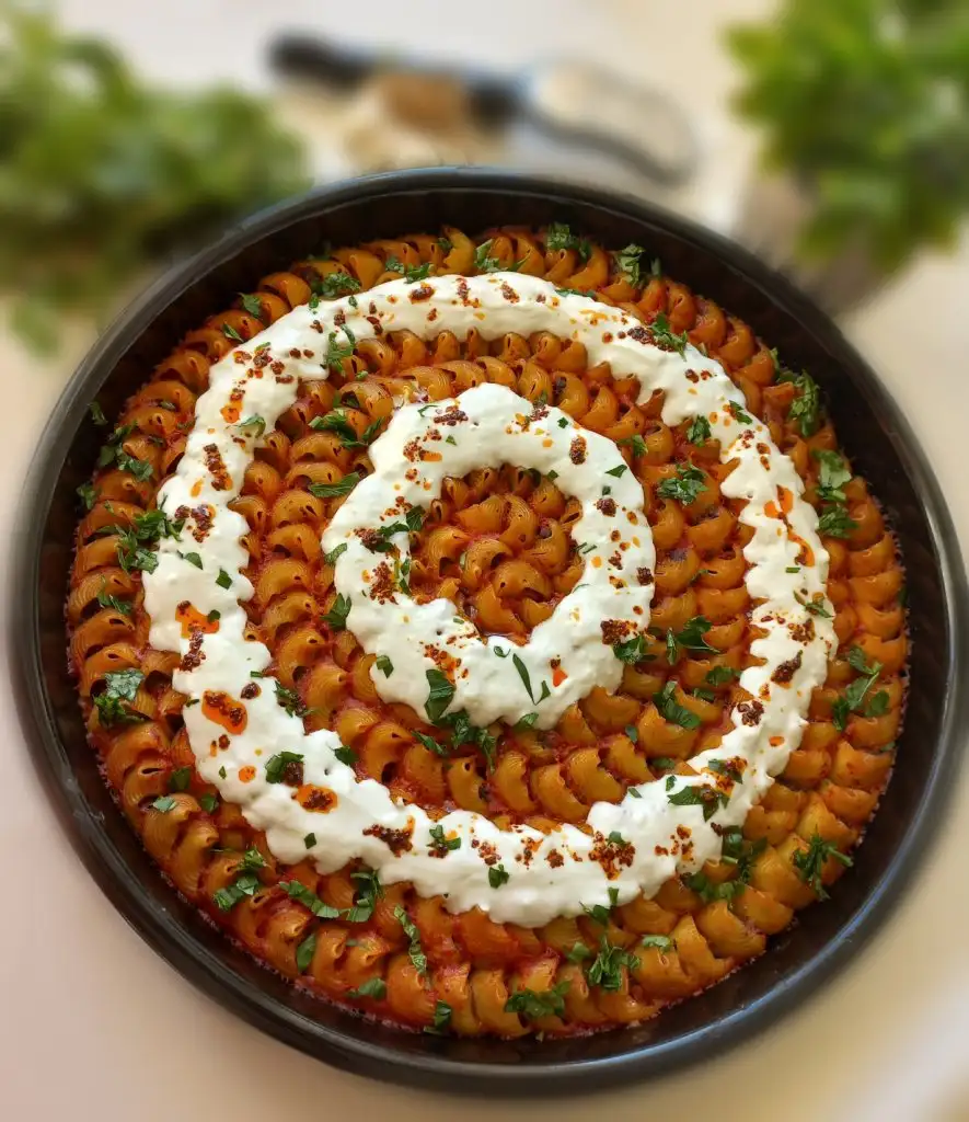 Sosu için; rendelenmiş sarımsak ve salçayı yağda kavuruyoruz. Ardından 4 su bardağı kadar şu ekleyip kaynatıyoruz. Sosumuzu kepçeyle makarnaların üzerine döküyoruz. Önceden ısıtılmış 180 derece fırında suyunu çekene kadar pişiriyoruz.Pul biberli sosumuzu hazırlıyoruz.