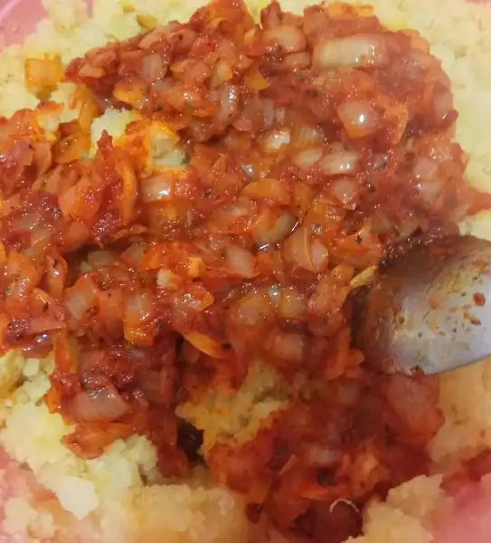 İyice karıştırıp üzerini kapatalım, bulgur patatesin sıcaklığıyla yumuşasın. Sonra üzerine 1 çay bardağı sıvı yağda kavrulmuş soğanın üzerine salça, tuz, pul biber, nane ve kara biberi ekleyip oluşan bu karışımı patatesli bulgurun üzerine ekleyip karıştırın.
