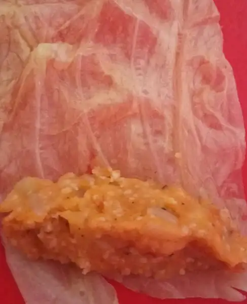 Haşladığımız lahana parçalarına 1 tatlı kaşığı iç harçtan koyup saralım