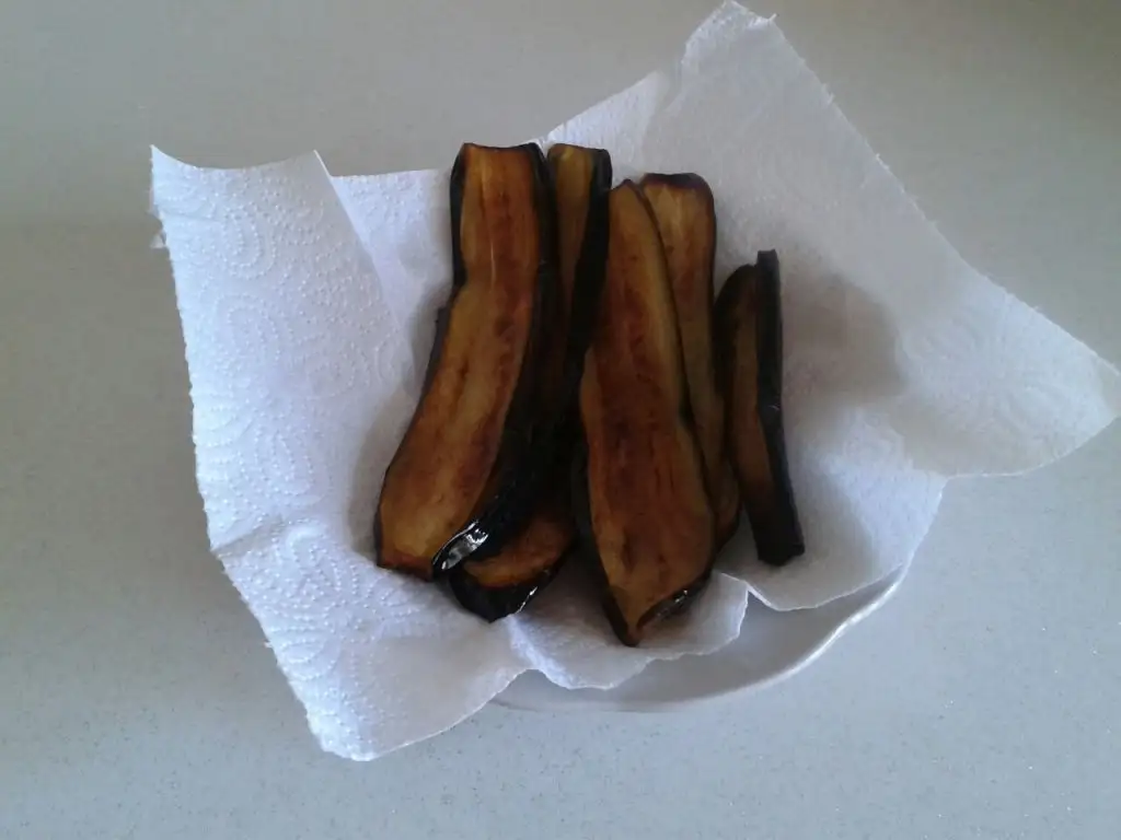 Patlıcanimizi alacalı soyup uzunlamasına ince ince doğrayın. Tuzlu suda bekletin, daha sonra suyunu süzüp duru suyla yıkayıp kağıt havluyla kurulayın. Sıvı yağ koyduğunuz büyük tavada iki taraflı kızartın. ( yağı bol koymayın. Eğer yağı çekip kalmazsa az ilave edersiniz tekrar) Pişen patlıcanları kağıt havluya koyun