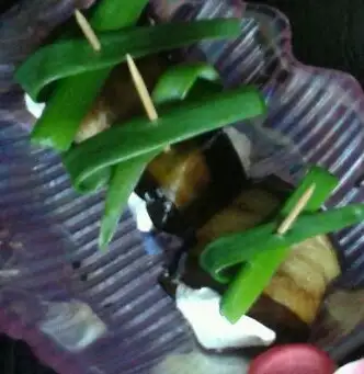 Patlıcanın uç kısmına yoğurdumuzdan koyup rulo sarın. İsterseniz taze soğanla bağlaya da bilirsiniz. Ben soğandan fiyonk yapıp kürdan batırdım.