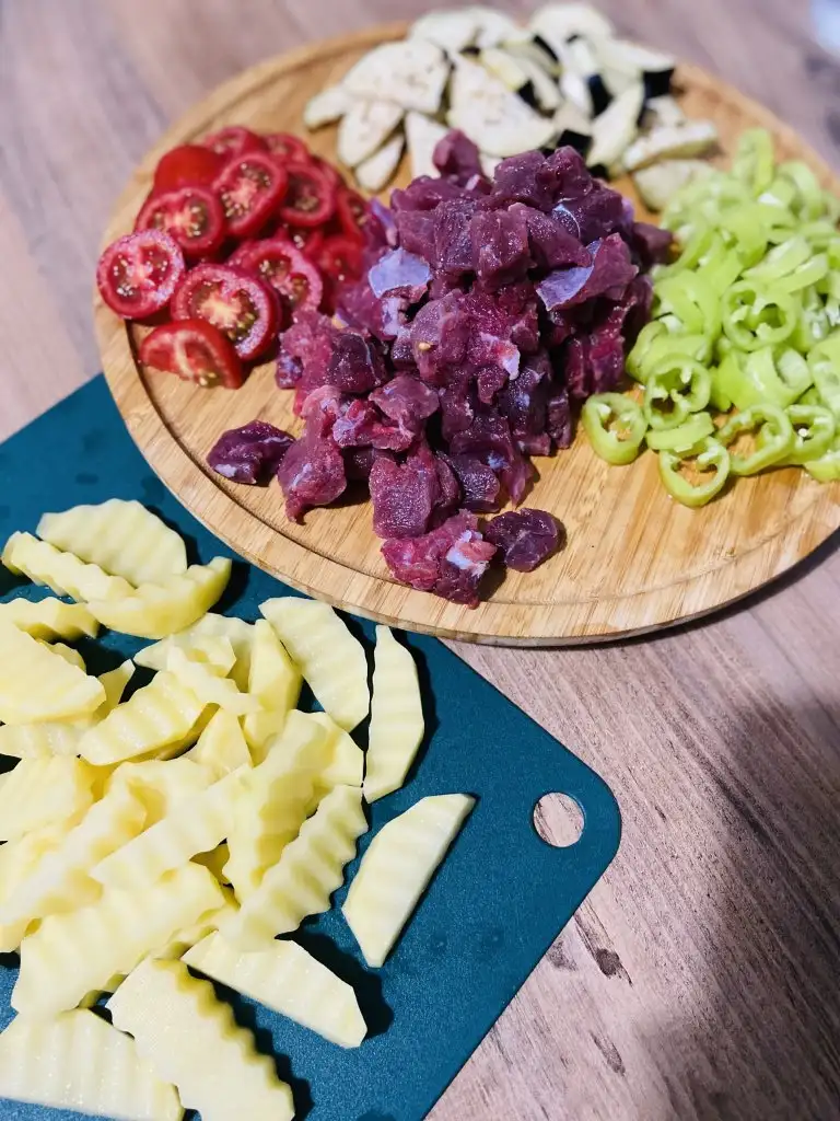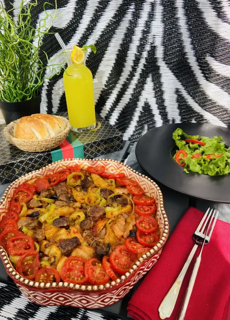 Patatesler ve patlıcanlar kızardıktan sonra fırın kabımıza alıyoruz suyunu çeken etlerimizide üzerine ekleyip karıştırıyoruz yeşil biber ve domatesleride üzerine ekliyoruz