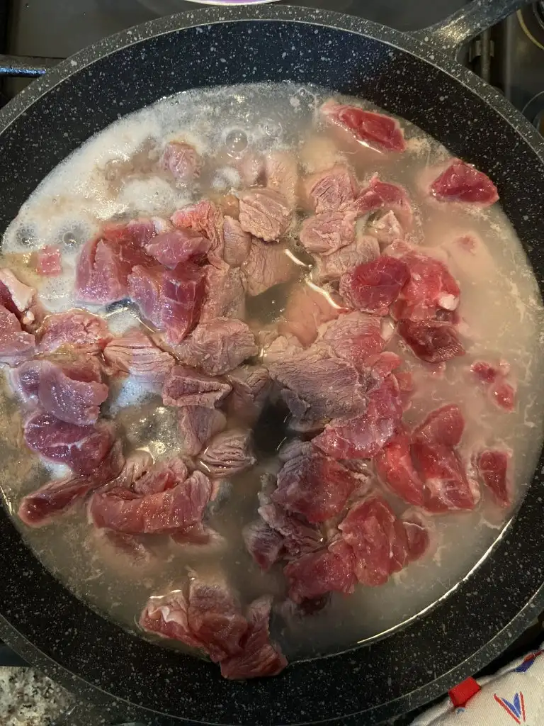 Öncelikle eti tavaya alıyoruz biraz sıcak su ekleyip kapağını kapatarak suyunu çekmesini bekliyoruz..