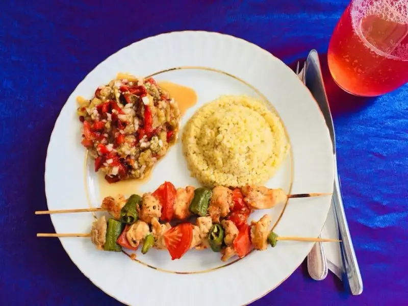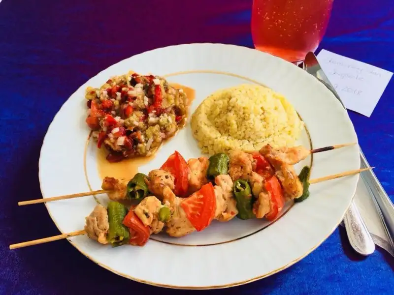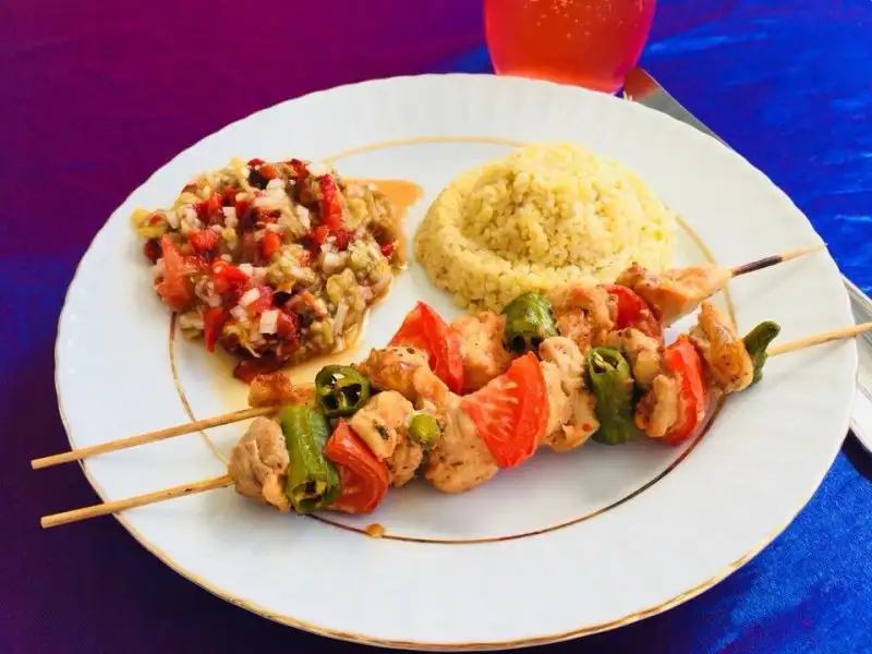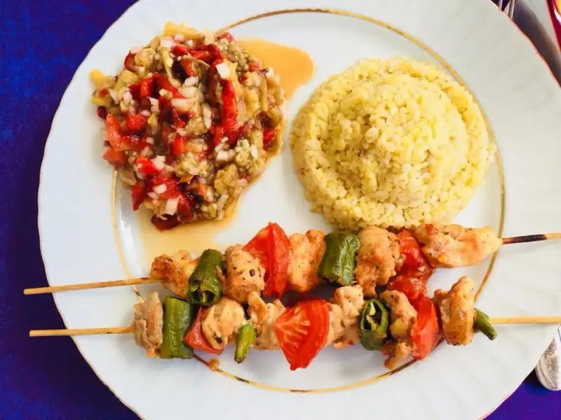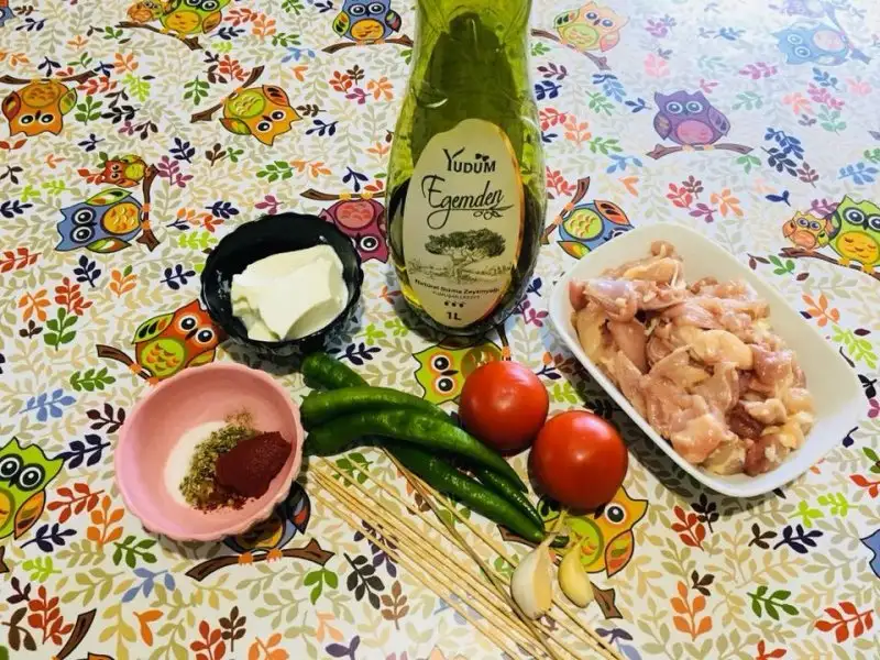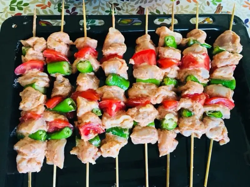 Domates ve biberlerimizi doğrayıp, marine edilmiş tavuklarımızla, bir tavuk eti bir domates-biber olarak şişe geçiriyoruz.