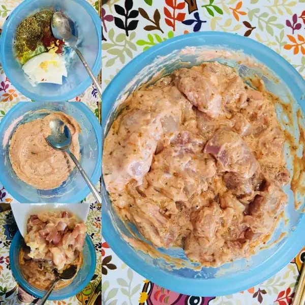 Önce sos malzemelerimizi karıştırıyoruz, daha sonra kuşbaşı tavuğumuzu ekleyip sosa buluyoruz ve 2-3 saat buz dolabında dinlenmeye bırakıyoruz.