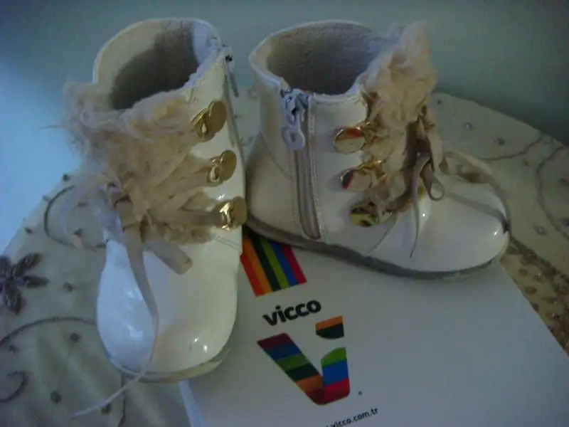 beyaz renk içi kısa kısa tüylü dışı rugan nubuk bağcıklı 21 no. kutusunda VİCCO marka kız çizmesi fiyatı 25 tl