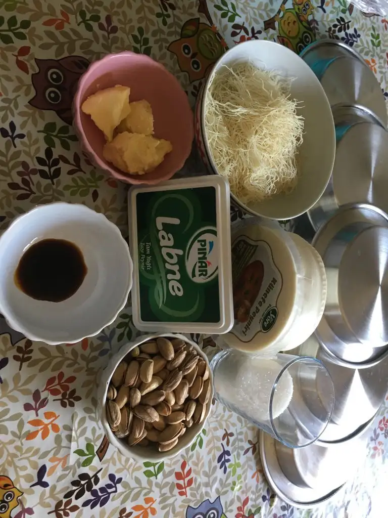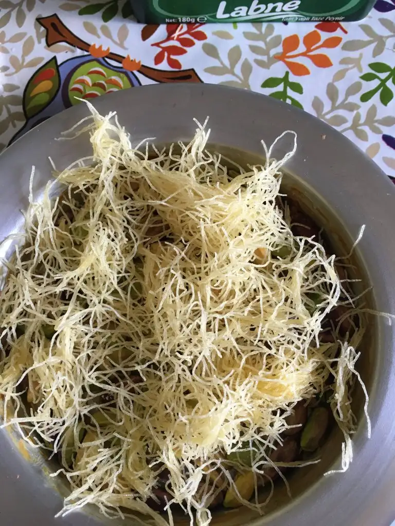 Pınar Labne’li künefe peynirimizi kadayıflı tabağa yerleştirip, üzerine kalan kadayıfımızı yerleştirip, künefe tabağımız ile düzlüyoruz.