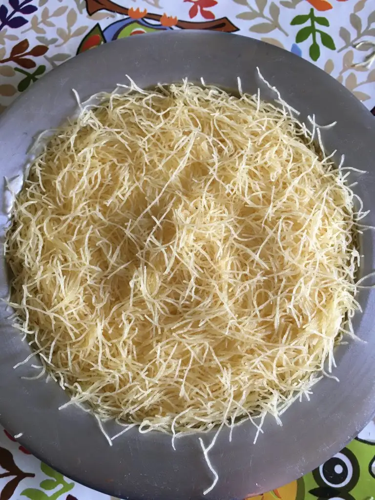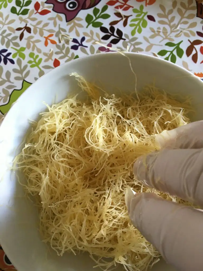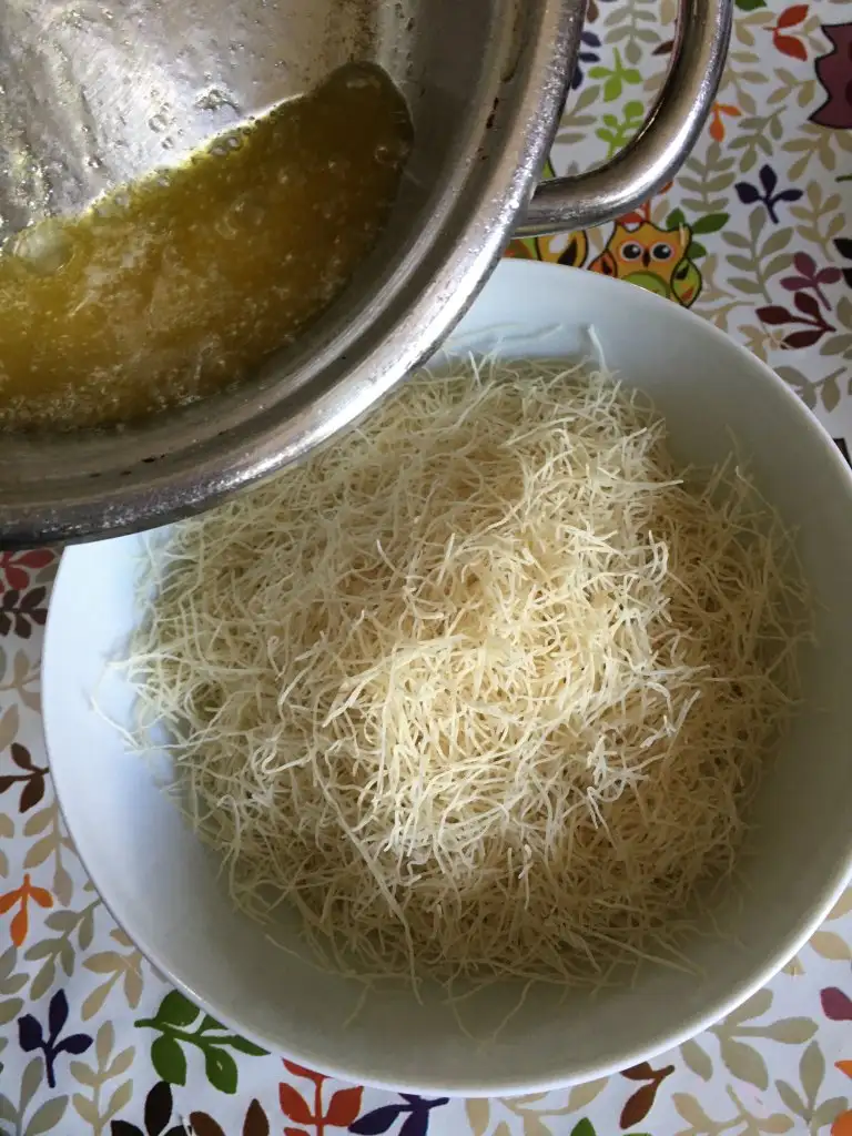Kadayıfımızı ufalayıp, erittiğimiz tereyağına buluyoruz.