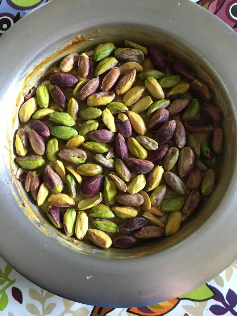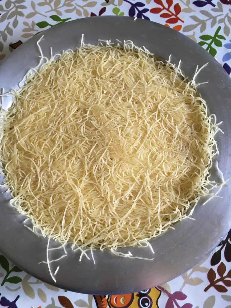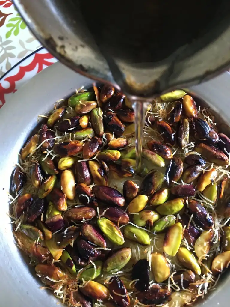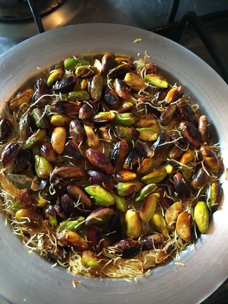 Fıstıkları tabağa döküp, üstüne kadayıfların yarısını döşeyip, bastırıp, düzlüyoruz.