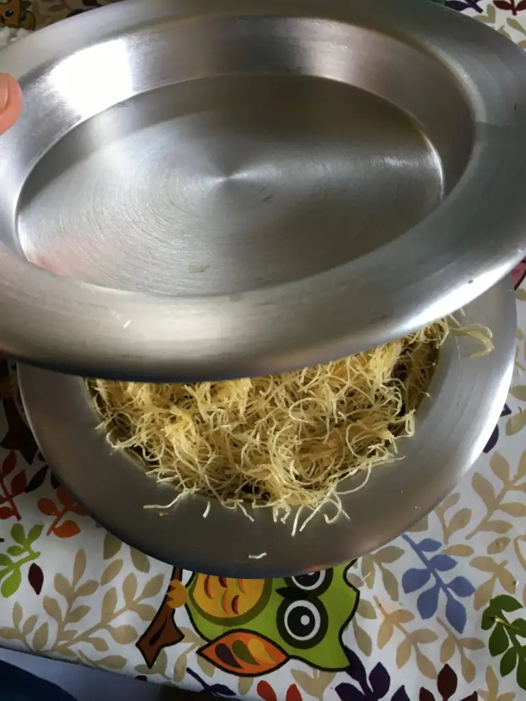 En kısık ateşte altını kızartıp, başka bir künefe tabağına çeviriyoruz. Diğer tarafını da kızartıp, soğuk şerbet ile buluşturuyoruz ve sıcak tüketiyoruz.