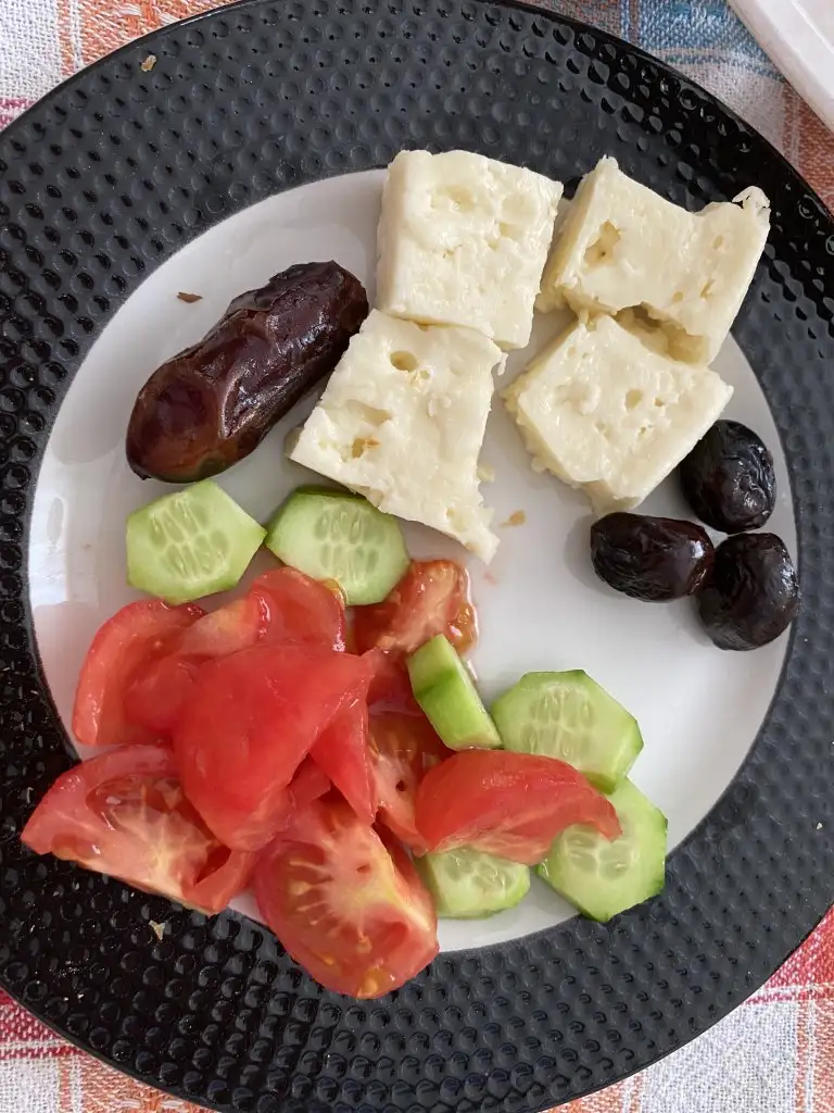 Kahvaltı : zeytin, peynir, domates salatalık, 1 dilim çok tahıllı ekmek, 1/2 lahmacun(😜😜 dün yemedim kendine ayırmıştım )