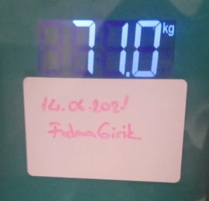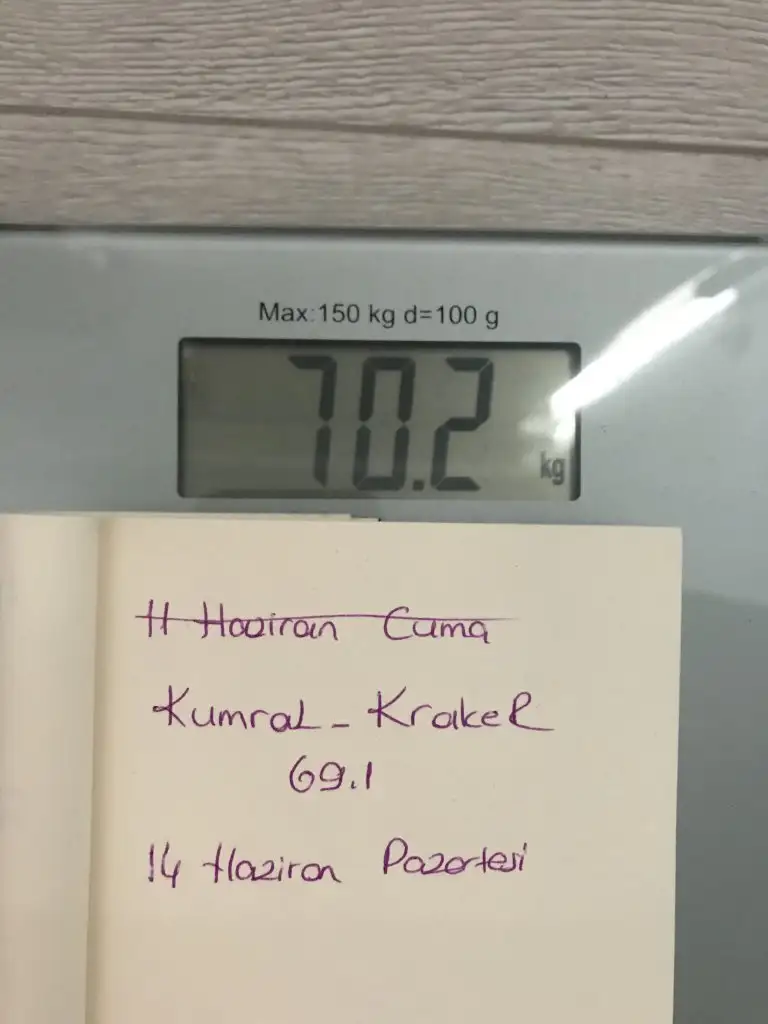 Valla söyle Bisey oldu bnm tartil hep sabit hiç Bi şekilde oynatmiyorum yerinden arkadaşlar ve annemi tarttim görümcemi üst komşumu komşumun arkadasini eşimi tarttim hepsi doğru çıktı Bn bu kiloda çıktım yani iki günde nasıl böyle olur inanamadim hatta bebeğimi tarttim onuda 200gram fazla gösterdi inşallah Bi yanlışlık yoktur diyoruuum cuma için hedef belirtmek istemiyorum gorumceme gidince de tartilcam aç karna farklı Bi sonuç olursa bildiririm burdan