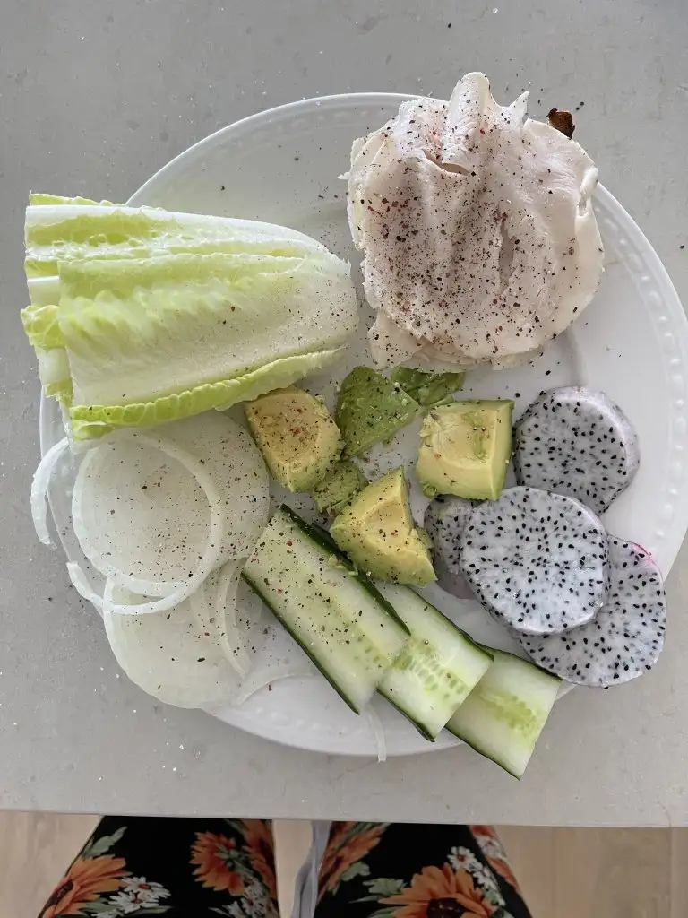 1 dilim ekşi mayalı tahıllı ekmek üzerine 3 dilim avokado, hindi füme ve bol yeşillik. Tabağıma ejder meyvesi de koydum ama çok doydum yiyemedim 🤪🤪