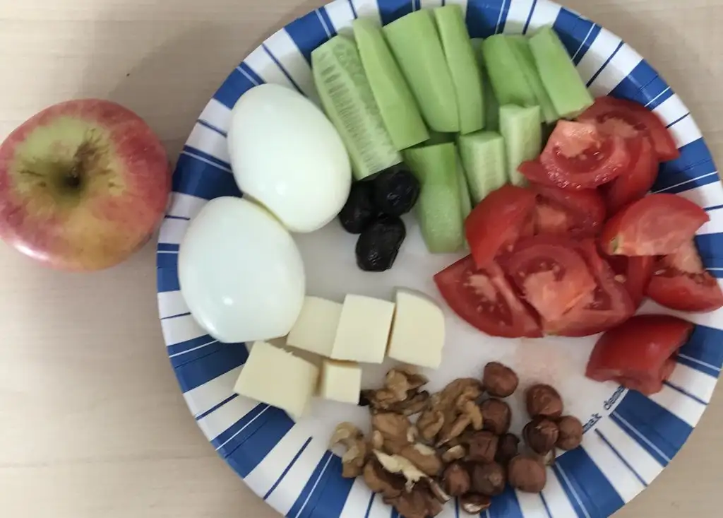 Sabah (08.00): Domates, Salatalık, 1 haşlanmış yumurta, 1 dilim tb ekmek, 1 dilim peynir, 5 zeytin