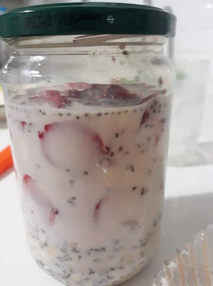 içinde chia . yulaf , çilek , keten tohumu . az bal . ve tabi süt.
