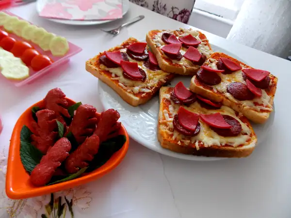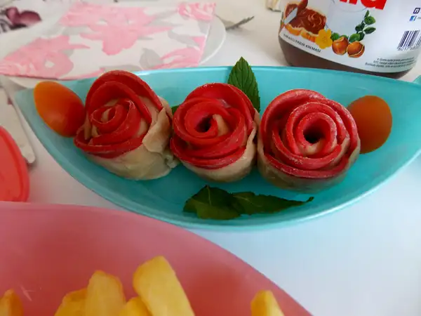 Beğenmedim ki, begenmeyecegim ki, fiyonk olmamış, sosisler harika durmuyor, ben gül sevmem ayçiçeği olsaydı begenirdim o da olmamış. Hele de yumurtalar hiç göze çarpmıyor