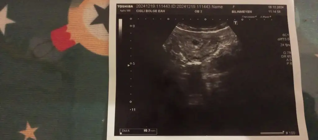 Her hamilelikte farklı oluyor aynı kişi olsa bile, hiç beklemiyorduk yine oldu,o kadar uğraştığımızda olmamıştı.Doktorlara göre 35 yaş mıydı neydi son yaş gebe olmak için veya çocuğunuzun olması mümkün değil diyorlar bir bakmışız hamileyim, Allah ol derse olur,her şey olacağına varır.Sol altta Dist A 10.7 mm çıktı bir de benim, resmini de atayım