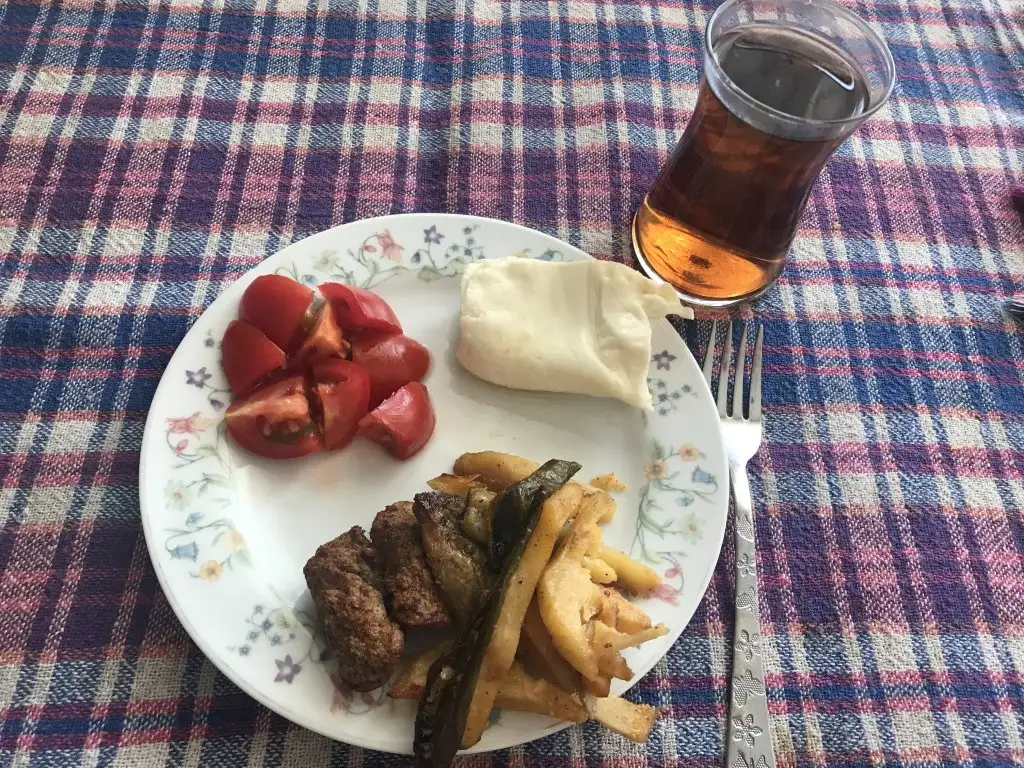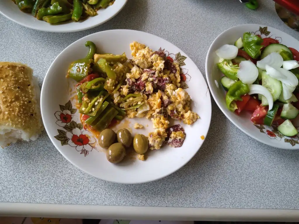 Afiyet olsunKahvaltı: Sucuklu yumurta, biber, zeytin, salata, bir dilim ekmek, çay