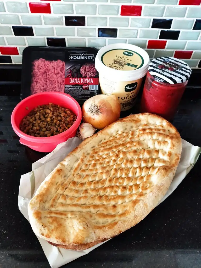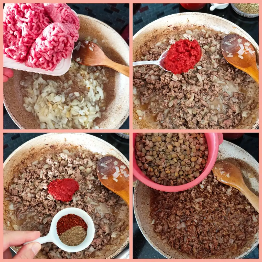 Ardından tavamıza yağ koyup yemeklik doğradığımız soğanları soteliyoruz. Soğanlar olunca kıymayı ekleyip kavurmaya devam ediyoruz. Kıyma pişince salça ve baharatları ekliyor son olarak da mercimeği ekleyip altını kapatıyoruz.