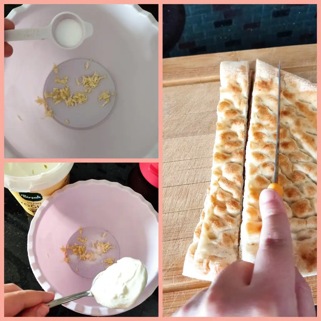 Sarımsaklı yoğurt için uygun bir kaba sarımsakları rendeleyip üzerine tuz ilave edip süzme yoğurdumuzu boşaltıyoruz. Pidelerimizi de küp küp doğruyoruz.